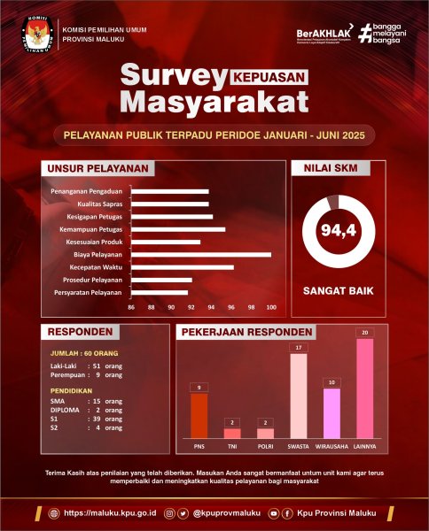 #TemanPemilih, kamu perlu tahu Hasil Survey Kepuasan Masyarakat (SKM) terhadap pelayanan publik terpadu Periode Januari – Juni 2025 di lingkungan KPU Provinsi Maluku, di infografik ini #KPUmelayani ....
