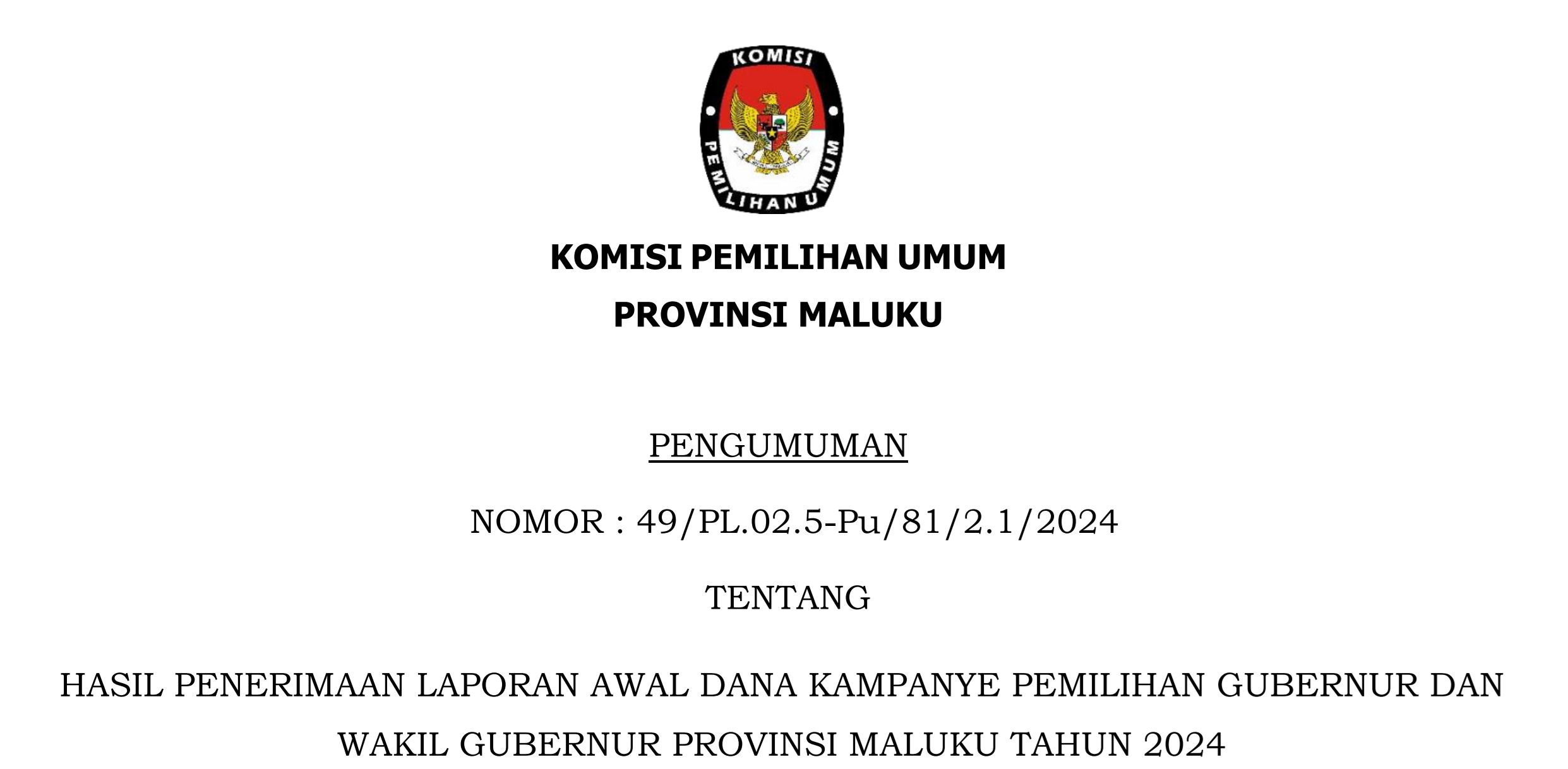 PENGUMUMAN KPU PROVINSI MALUKU NOMOR : 63/PP.03.2-Pu/81/3.2/2024