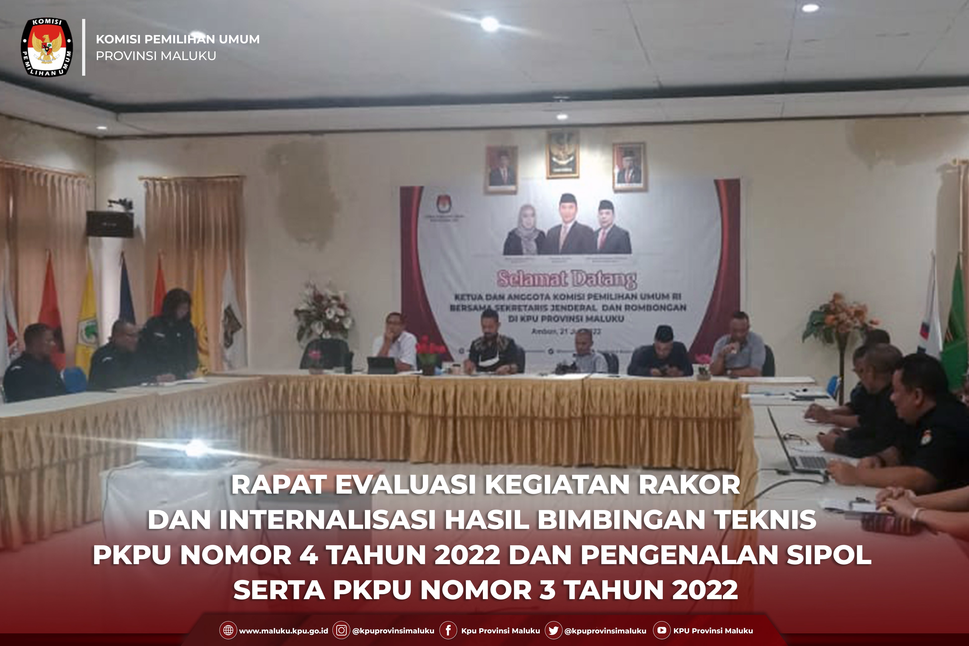 Hari ini bertempat di ruang rapat kantor KPU Provinsi Maluku, telah dilaksanakan Rapat Evaluasi Kegiatan Rakor dan Internalisasi Hasil Bimbingan Teknis PKPU Nomor 4 Tahun 2022 dan Pengenalan (Sistem Informasi Partai Politik) SIPOL serta PKPU Nomor 3 Tahun 2022.
