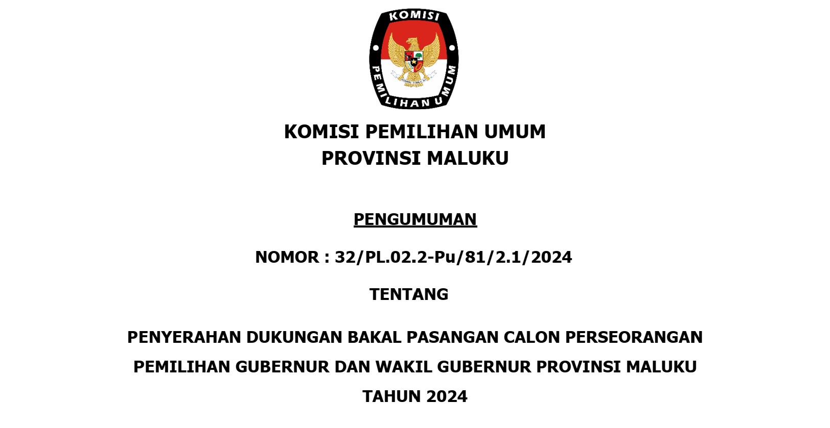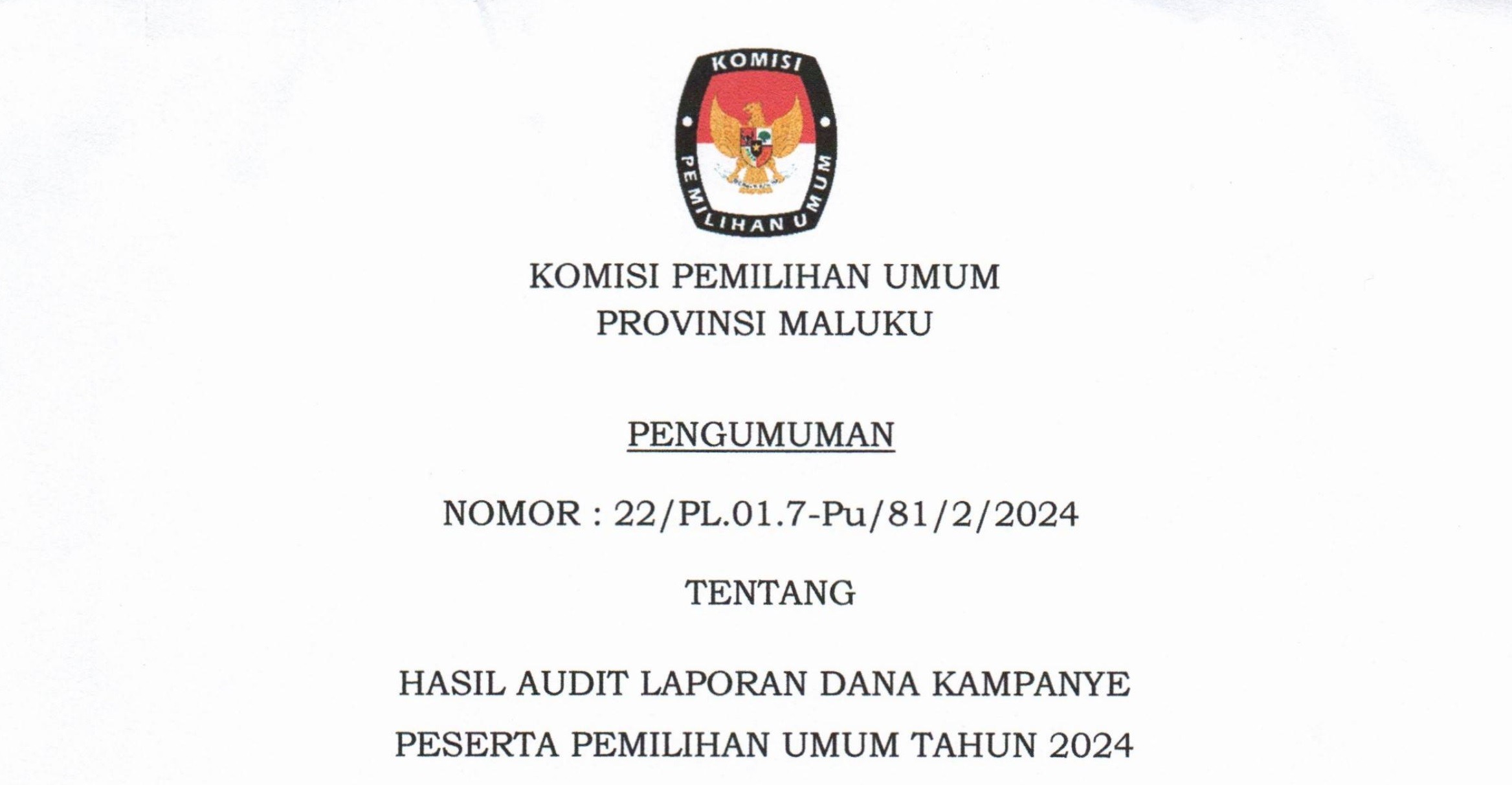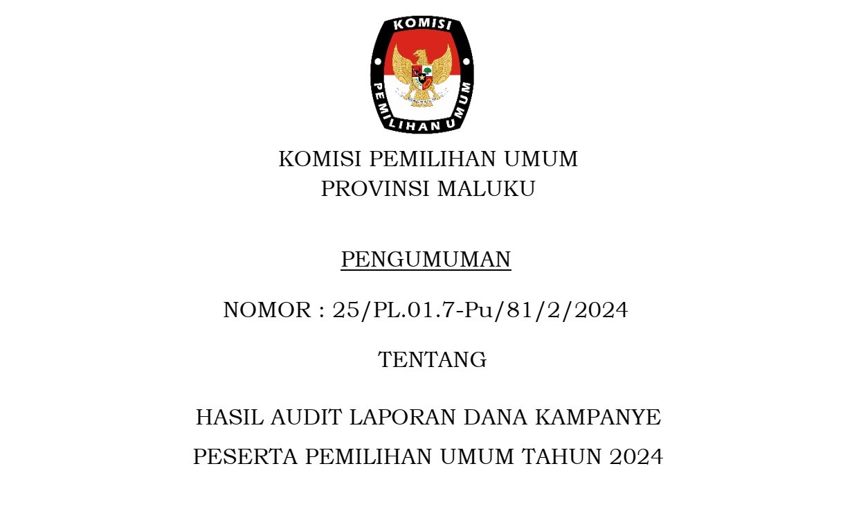 Berikut disampaikan Pengumuman KPU Provinsi Maluku Nomor: 25/PL.01.7-Pu/81/2/2024 tentang Hasil Audit Laporan Dana Kampanye Peserta Pemilihan Umum Tahun 2024.